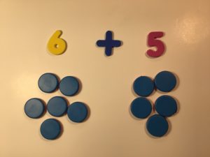 Representamos la suma con los contadores. En un grupo seis contadores y en el otro cinco.