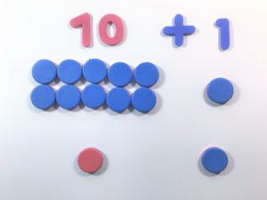 Cuando tenemos diez contadores en un grupo retiraremos todas las fichas azules y las sustituiremos por uno rojo, que representa las decenas. He ahí nuestro resultado.