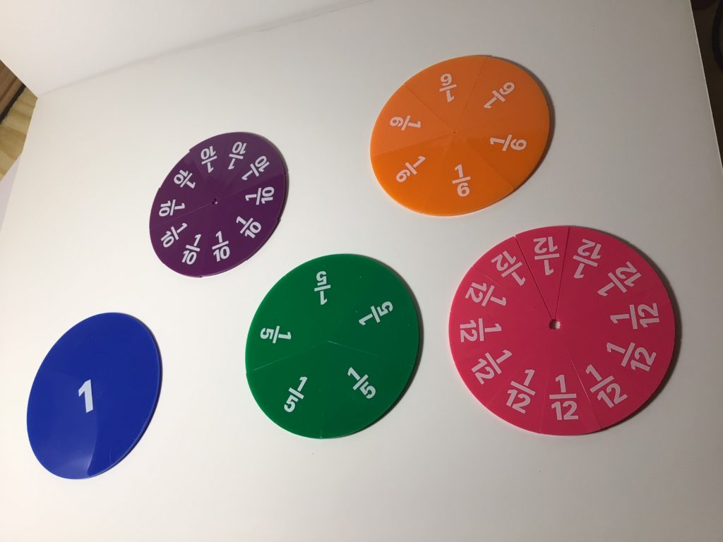 Con este material mostrado arriba, el alumno/a interioriza mejor el sentido de fracción y puede manipular los quintos o los doceavos. Sabe lo que ocupan dos quintos, etc…